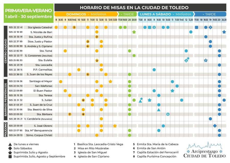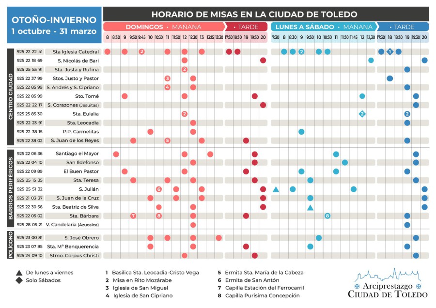 - Todos los días, media hora antes y durante las misas (si es posible).
